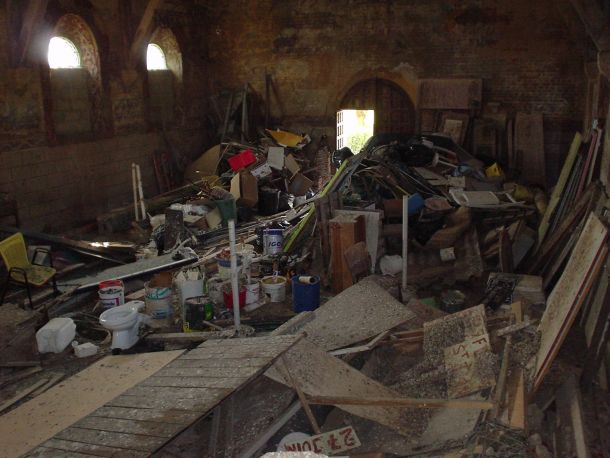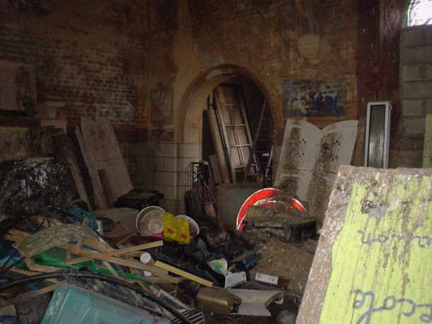 Après vingt-cinq ans d'abandon, l'église présentait un état de délabrement avancé. L'eau s'infiltrait par plusieurs points, les pierres étaient saturées d'humidité, et de nombreux pigeons avaient élu domicile dans la charpente. Les vitraux avaient disparu, remplacés par des parpaings, et l'intérieur était encombré d'objets divers accumulés au fil des années.