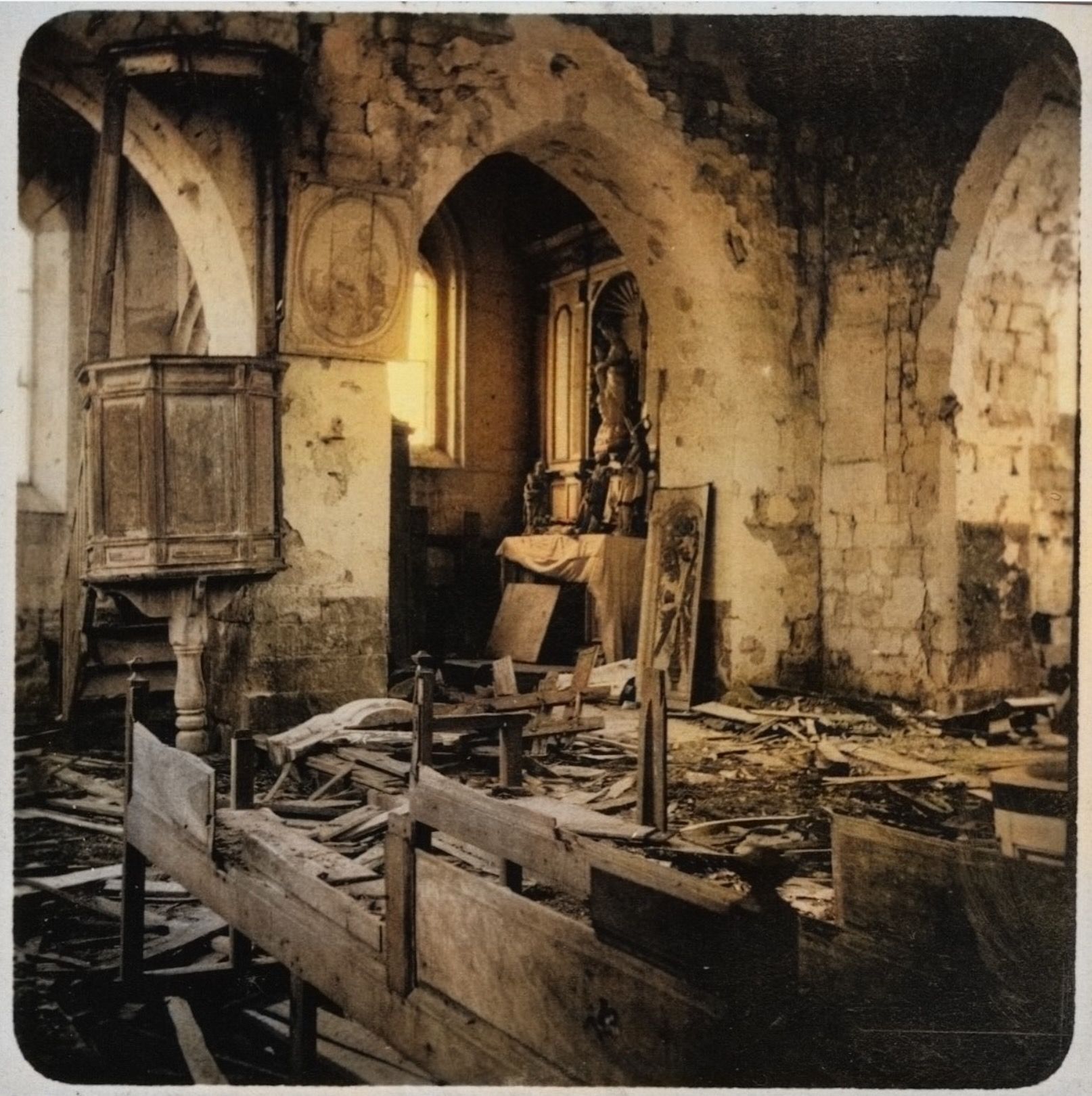 Privée de sa fonction sacrée, l’ancienne église de Becquincourt sombre peu à peu dans l’indifférence. Les années passent, et les murs autrefois neufs se fissurent sous l’effet du temps et de l’abandon.
