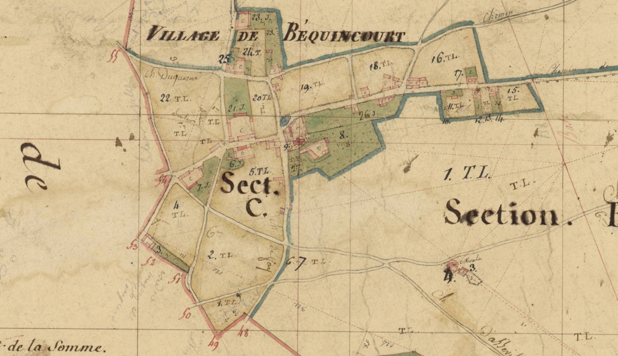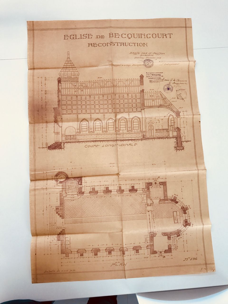 Aucune image de cette époque n’existe, mais j’ai retrouvé les plans, les devis et les documents de négociation aux archives départementales de la Somme, dans les dossiers “R” pour Reconstruction.